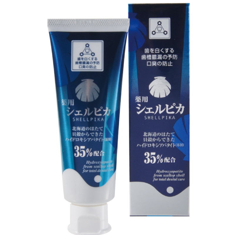 天然ホタテ貝殻を原料としたハイドロキシアパタイトを35%も配合した薬用歯磨剤です。アパタイトにはエナメル質表面の微細なキズを埋めて汚れを付きにくくする効果や、口腔内や歯周ポケットにあるプラークや毒素を吸着する働きがあります。