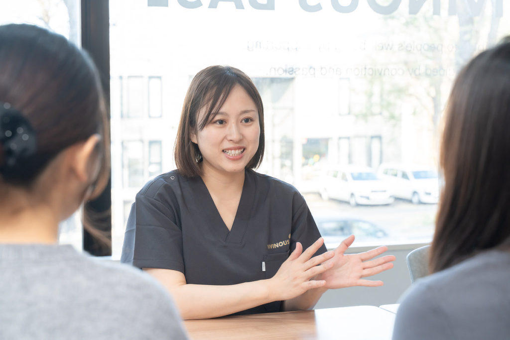 浅野 出産、育児で一旦臨床を離れたのですが、札幌の歯科医療法人にパートで復職しました。そのうちに少しずつ任せていただける仕事が増えていき、子どもが大きくなってフルタイムで働くことが可能になった段階で、主任として現場をまとめる立場になったのです。最初の頃はまだ規模も大きくなかったのですが、分院展開がどんどん進み、スタッフも100人クラスになりましたので、マネジメントに割く時間が多くなりました。スタッフ教育はもちろん、採用にかかわる学生への対応など、自身の臨床以外の面で大変勉強になったと思います。また、分院の開業に携わらせていただいたことも大きな経験でした。クリニックの図面を見て動線を考えたり、備品の発注などの開業前の仕事から、オープンニングスタッフとしてスタッフ教育を兼ねて数ヶ月勤務するということを7医院もさせていただき、これは私にとってすごい強みだなと感じています。