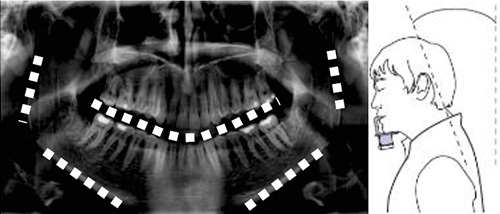 8. 【パノラマ撮影】犬歯ガイドを犬歯中央に合わせる(機種により犬歯遠心の場合あり)